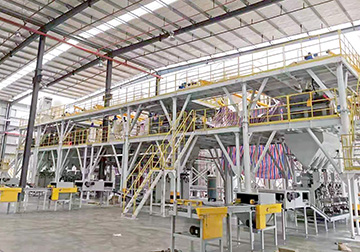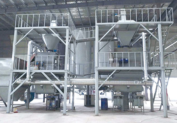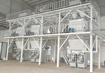 自流平砂漿生產(chǎn)線外層螺帶與筒壁間隙小于5mm,軸端密封設(shè)計講究不漏粉,混合不留死角,攪拌3-5分鐘均勻度可達98以上,配有螺旋上料機,上料方便、效率較高,放料殘留少,包裝多采用閥口袋配合閥口袋自動定量干粉包裝機(葉輪式閥口袋包裝機和氣吹式閥口袋包裝機二選一)自動計量灌裝,節(jié)省人工、提高生產(chǎn)效率。